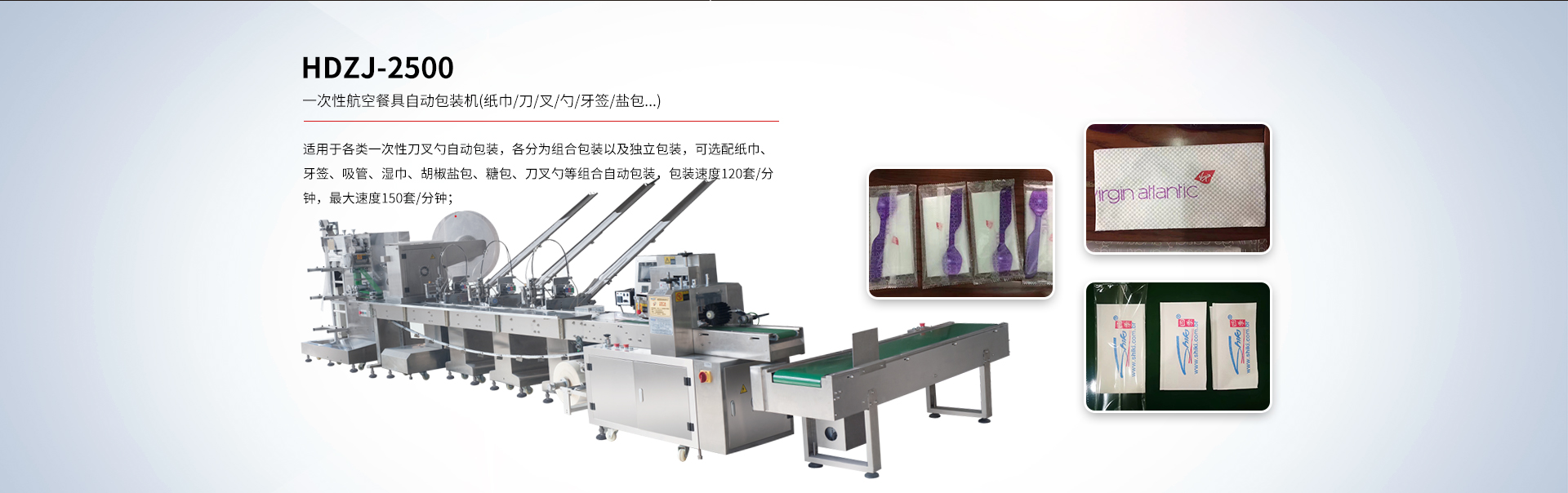 • HDZJ-2500 一次性航空餐具自動(dòng)包裝機(jī)(紙巾/刀/叉/勺/牙簽/鹽包...)
